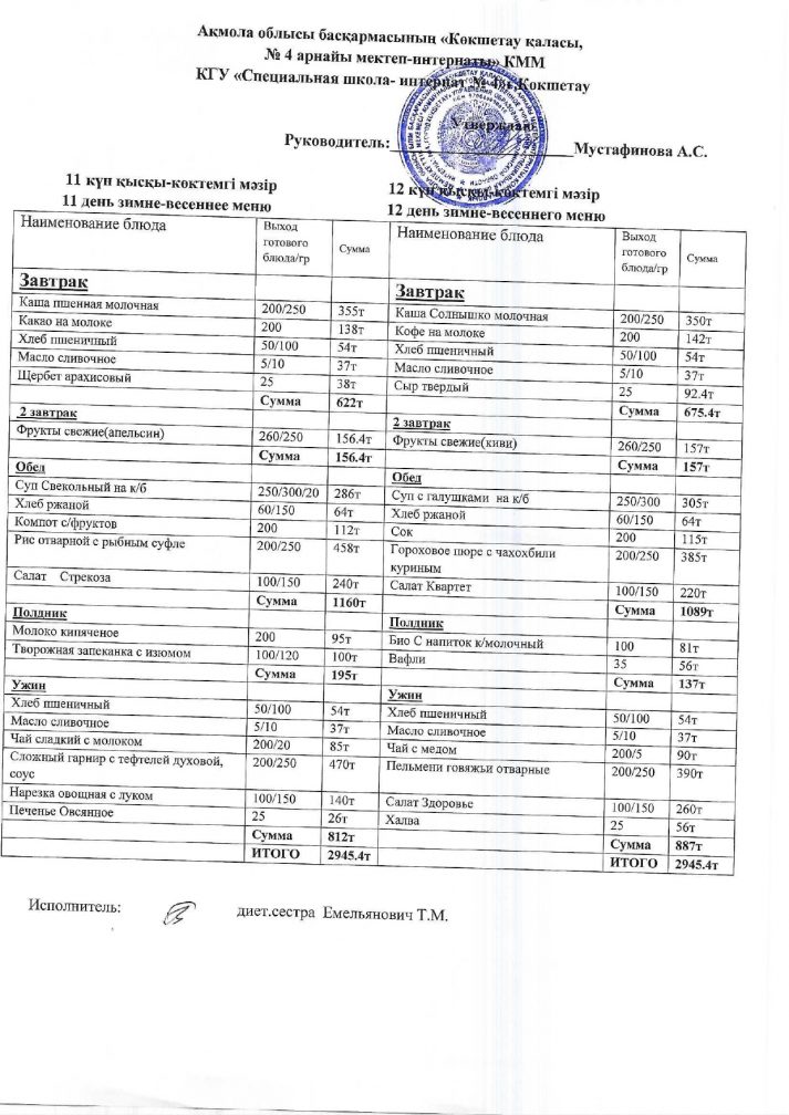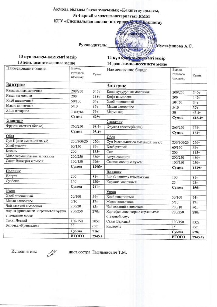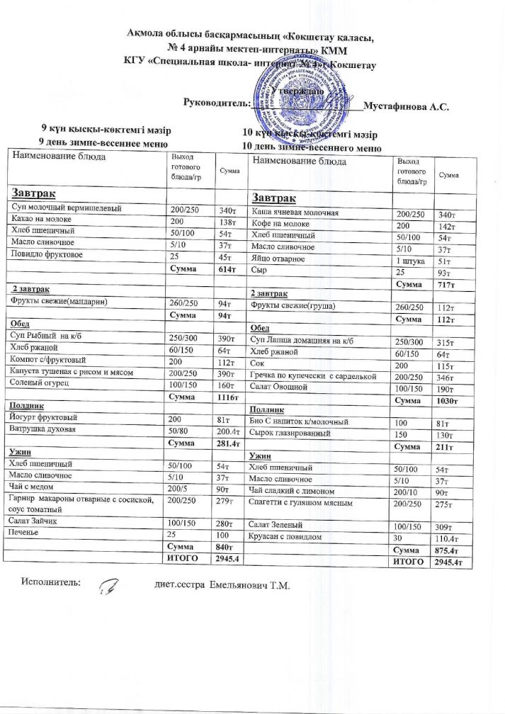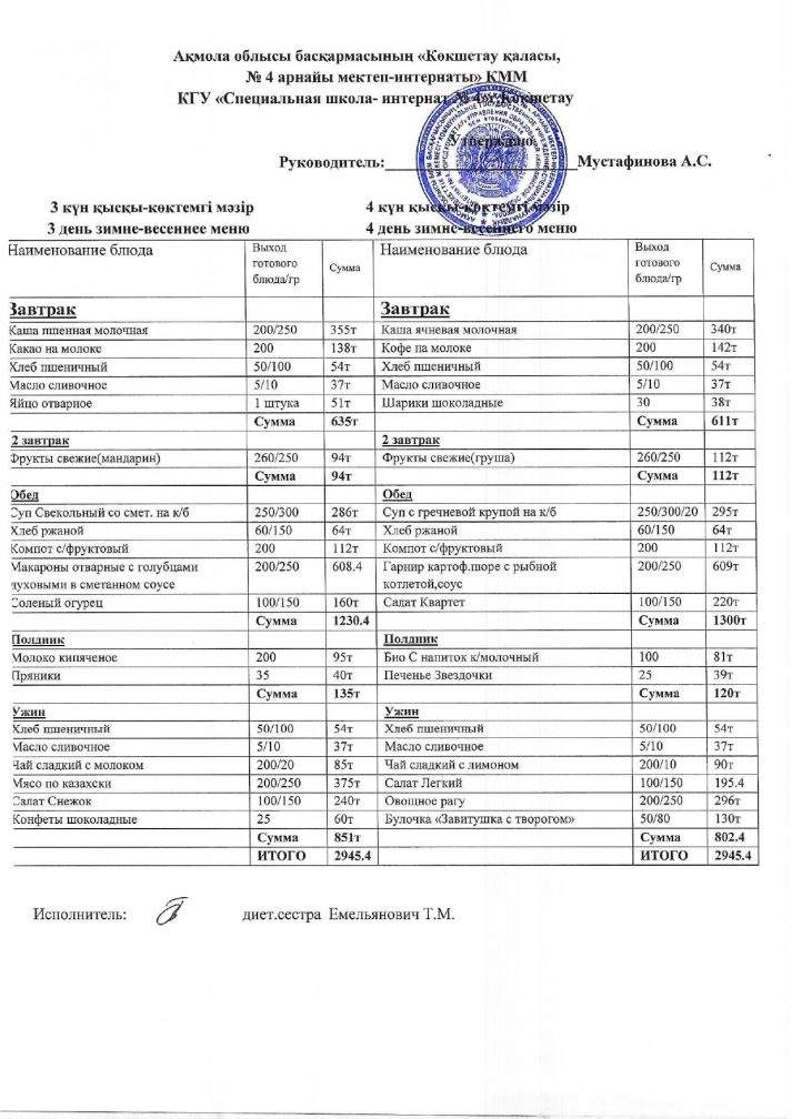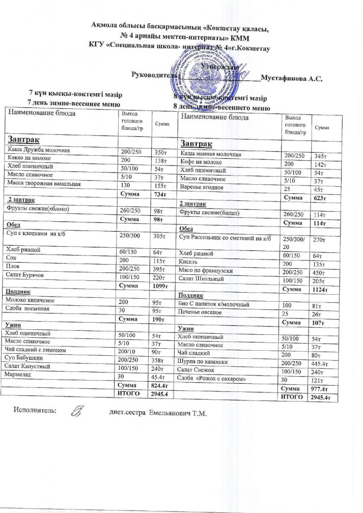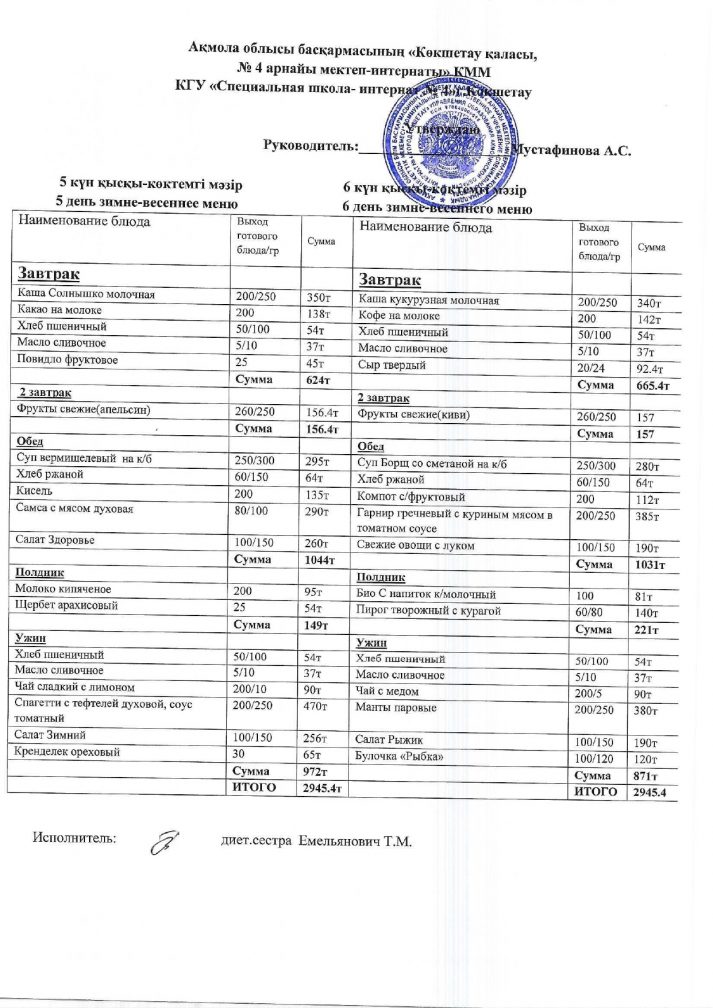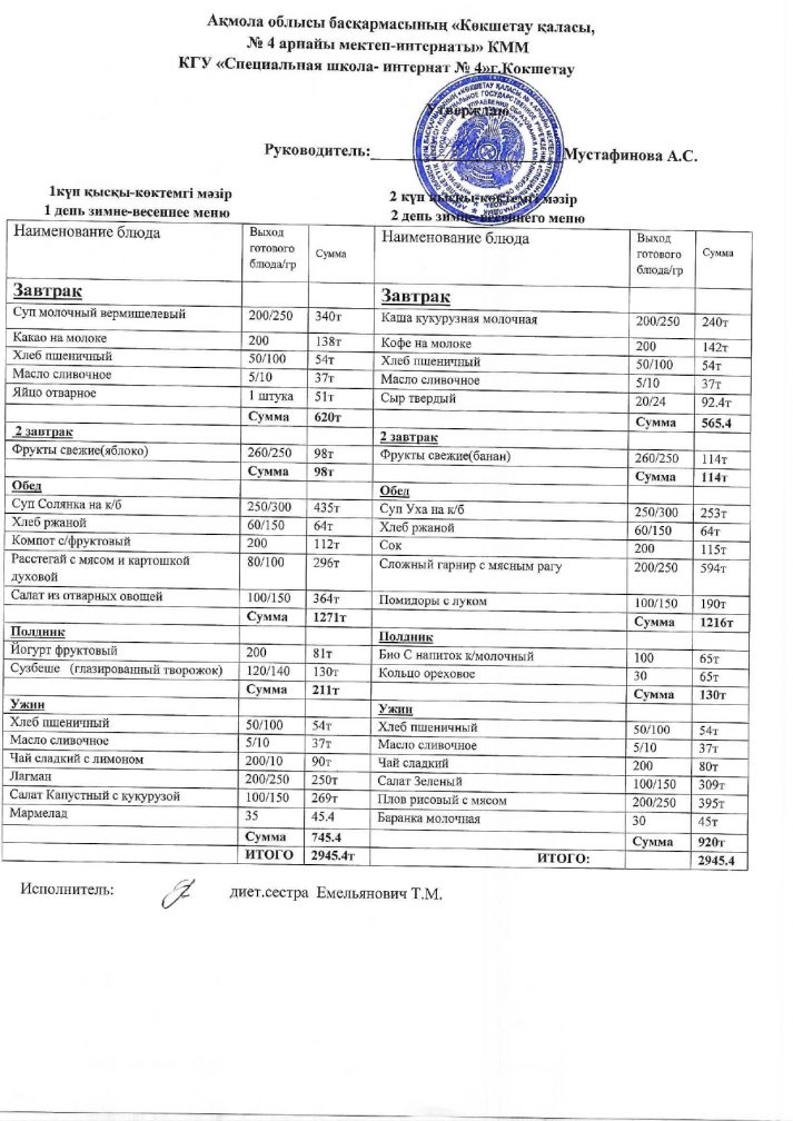 2024/2025 оқу жылына арналған бағалары бар мәзір.