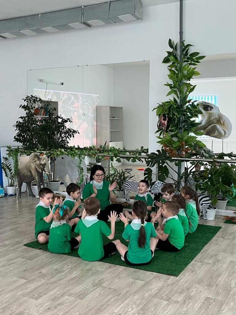 Ж. К. Казиева 0 “Е”сыныбында” Ритмикалық әрекеттер. Джунгли ритмикасында: Африкаға саяхат” атты ашық сабақ өткізді. Сабақ Африка мәдениетінен шабыттанған ойын және би жаттығулары арқылы сөйлеу қабілеті бұзылған балаларда ритмикалық сезім мен үйлестіруді дамытуға арналды. Сабақ барысында түрлі әдістер қолданылды, соның ішінде музыкалық аспаптармен жұмыс (маракалар, дабылдар), имитациялық жаттығулар (жануарлар қозғалысы), африкалық мотивтегі би элементтері. “Африкаға саяхат” тақырыбын пайдалану балалар үшін сабақты қызықты әрі тартымды етуге мүмкіндік берді. Сабақ қуаныш пен шығармашылық атмосферасында өтті. Балалар ұсынылған барлық тапсырмаларға белсенді қатысты, жануарлардың қимылдарына еліктеп, африкалық музыкамен ритмикалық жаттығулар жасады. Қатысқан мұғалімдердің пікірінше, сабақ жақсы құрастырылған және сөйлеу қабілеті бұзылған балаларда ритмикалық сезімді дамытудың тиімді әдістерін көрсетті.